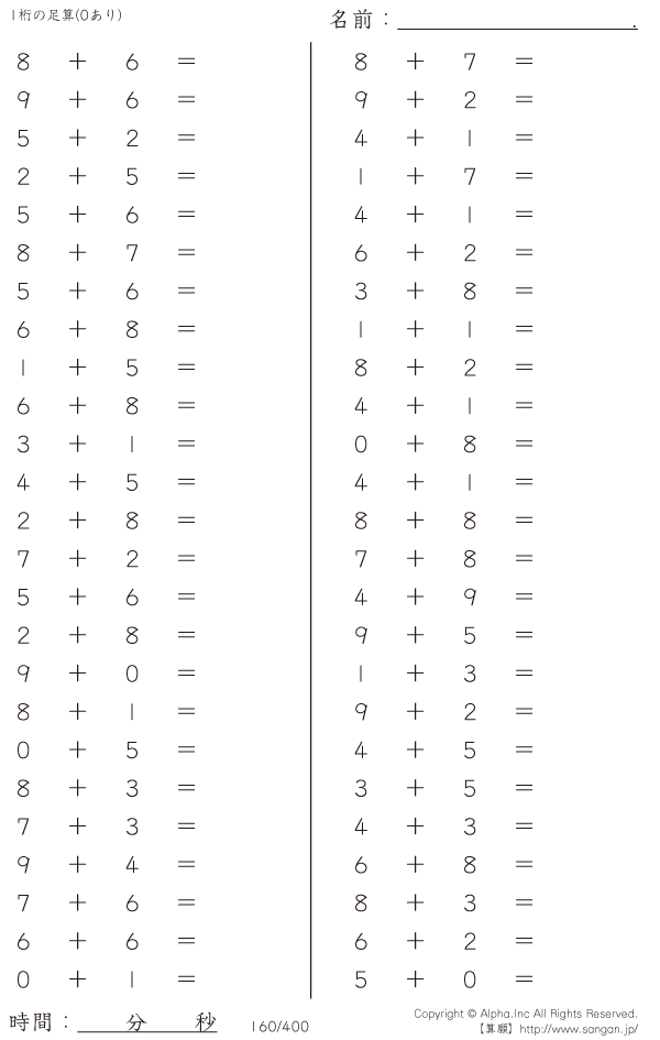 上記のボタンから「1桁の足し算(0あり)」の算数数学ドリル・計算ドリル(PDFプリント)がダウンロードできます。個人利用は無料です(家庭以外での配布は有料です)。