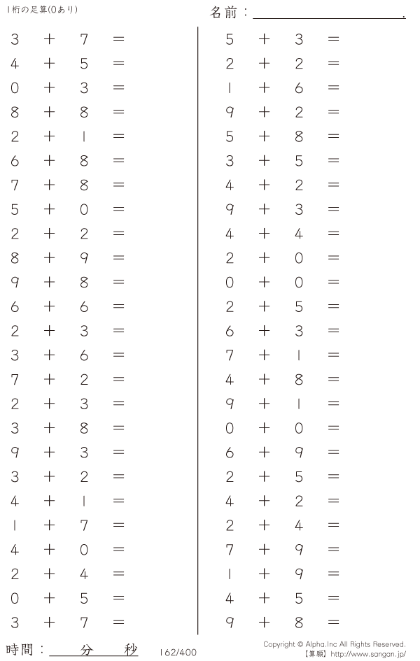 上記のボタンから「1桁の足し算(0あり)」の算数数学ドリル・計算ドリル(PDFプリント)がダウンロードできます。個人利用は無料です(家庭以外での配布は有料です)。