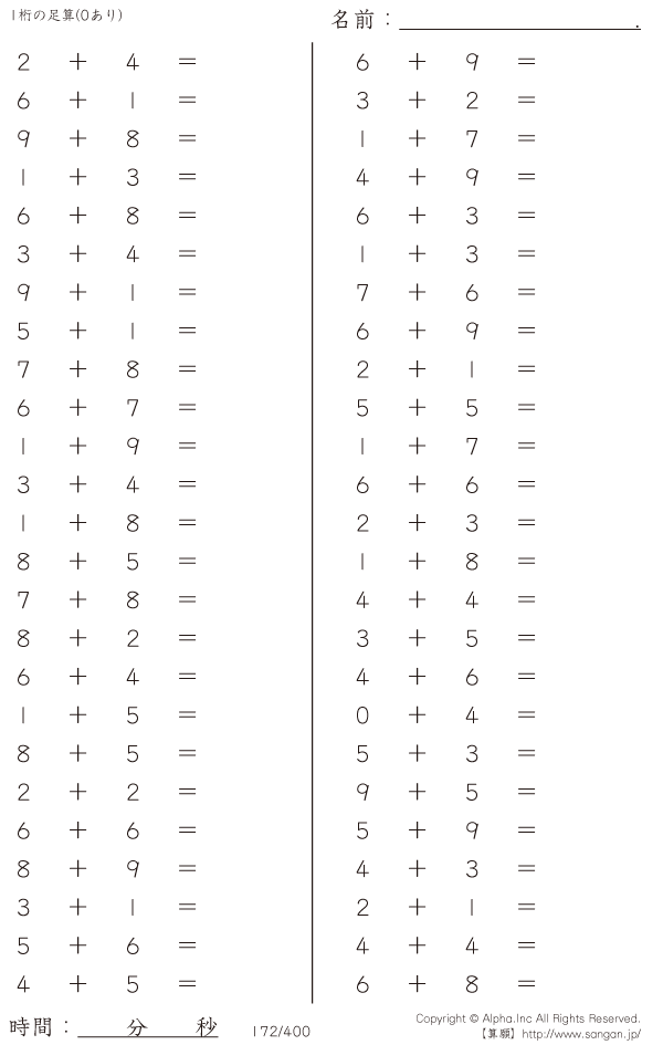 1桁の足し算(0あり) [問題]172/400