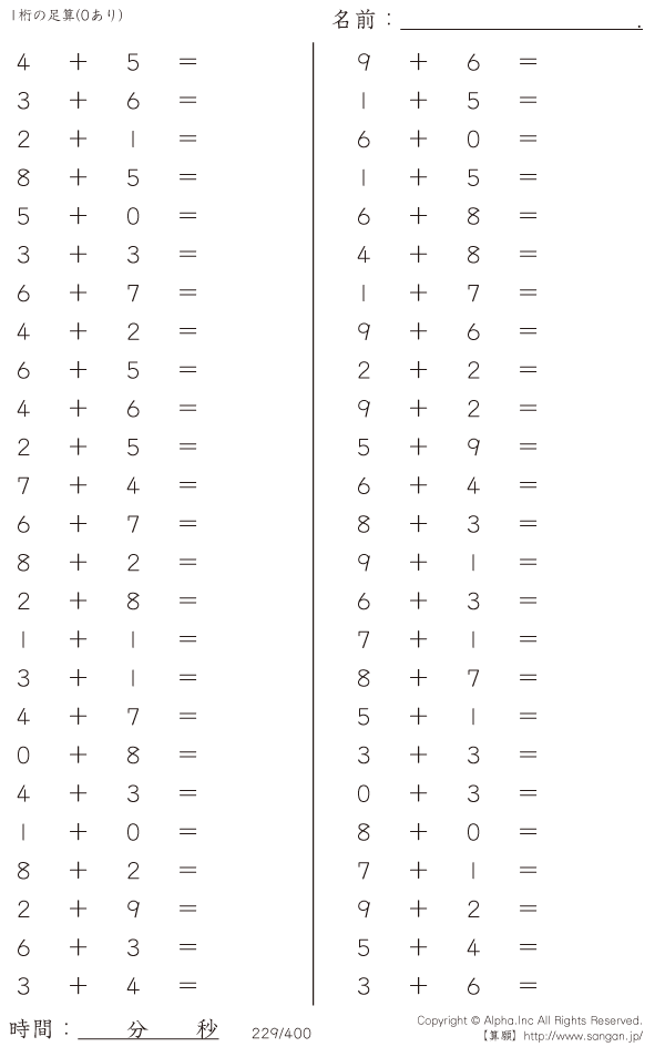 上記のボタンから「1桁の足し算(0あり)」の算数数学ドリル・計算ドリル(PDFプリント)がダウンロードできます。個人利用は無料です(家庭以外での配布は有料です)。