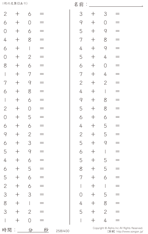 上記のボタンから「1桁の足し算(0あり)」の算数数学ドリル・計算ドリル(PDFプリント)がダウンロードできます。個人利用は無料です(家庭以外での配布は有料です)。