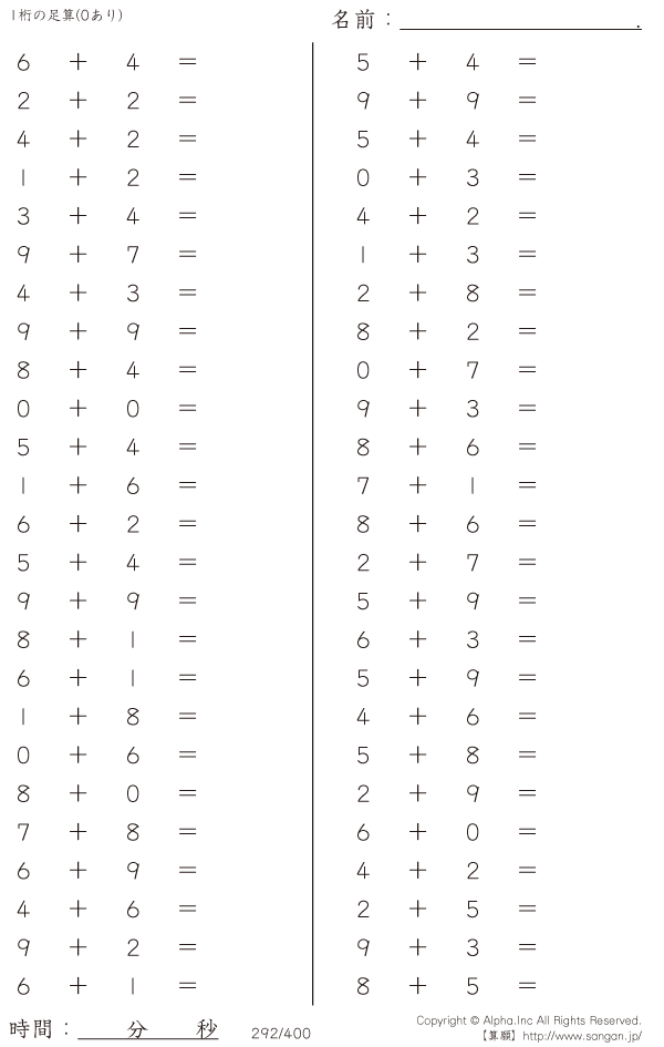 1桁の足し算(0あり) [問題]292/400
