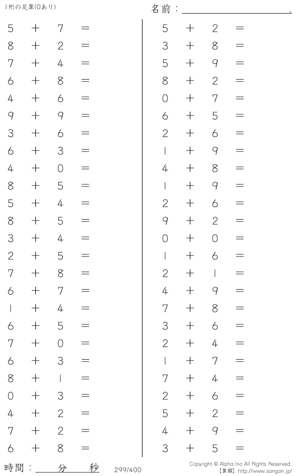 上記のボタンから「1桁の足し算(0あり)」の算数数学ドリル・計算ドリル(PDFプリント)がダウンロードできます。個人利用は無料です(家庭以外での配布は有料です)。