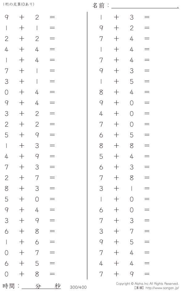 上記のボタンから「1桁の足し算(0あり)」の算数数学ドリル・計算ドリル(PDFプリント)がダウンロードできます。個人利用は無料です(家庭以外での配布は有料です)。
