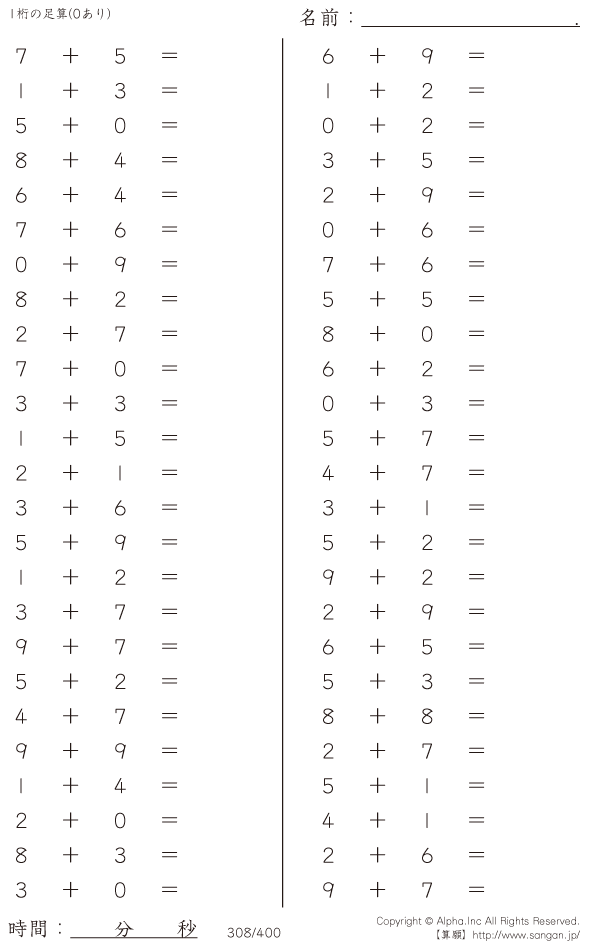 上記のボタンから「1桁の足し算(0あり)」の算数数学ドリル・計算ドリル(PDFプリント)がダウンロードできます。個人利用は無料です(家庭以外での配布は有料です)。