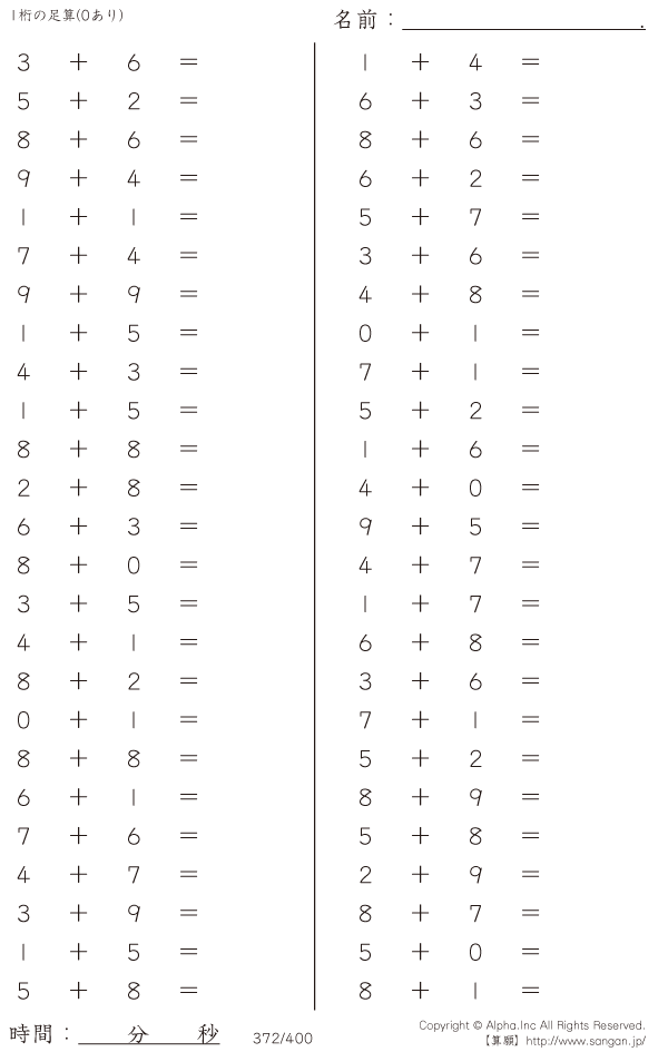 1桁の足し算(0あり) [問題]372/400