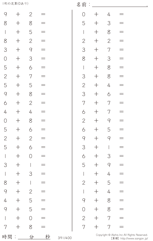 上記のボタンから「1桁の足し算(0あり)」の算数数学ドリル・計算ドリル(PDFプリント)がダウンロードできます。個人利用は無料です(家庭以外での配布は有料です)。