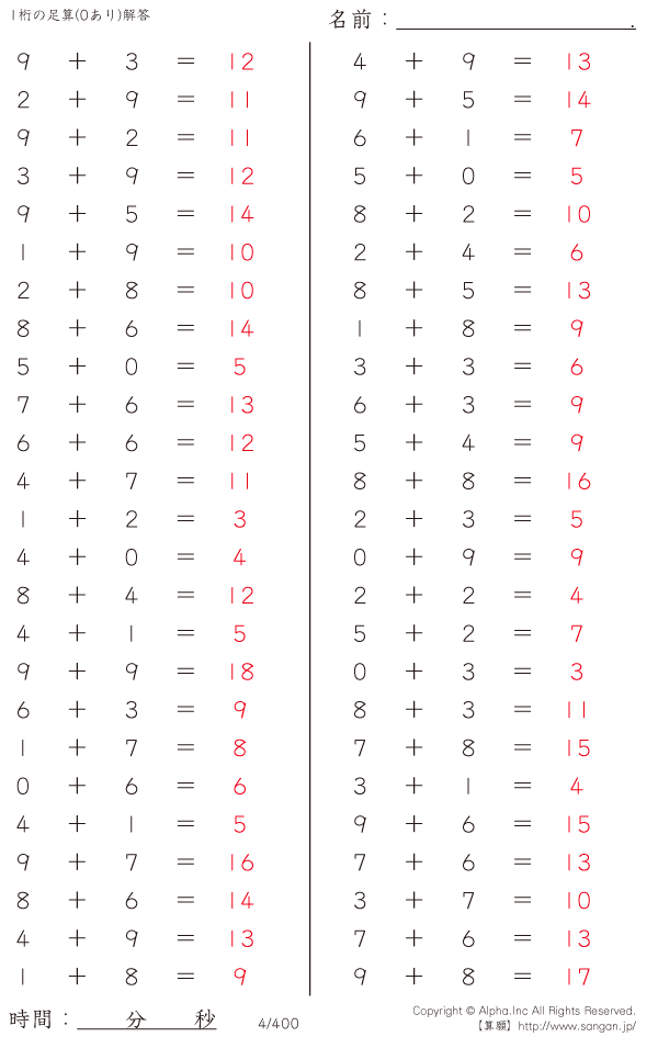上記のボタンから「1桁の足し算(0あり)」の算数数学ドリル・計算ドリル(PDFプリント)がダウンロードできます。個人利用は無料です(家庭以外での配布は有料です)。