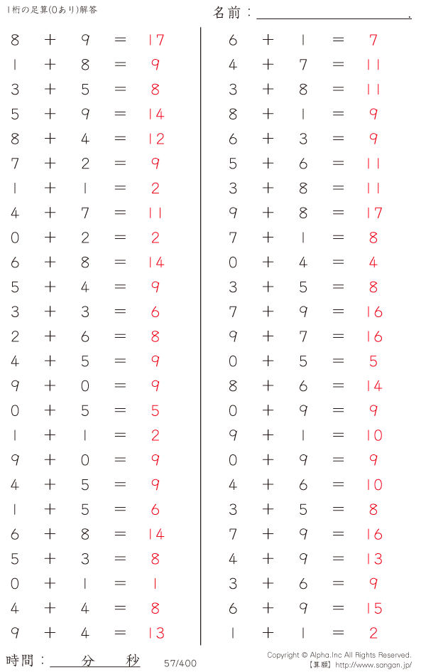 上記のボタンから「1桁の足し算(0あり)」の算数数学ドリル・計算ドリル(PDFプリント)がダウンロードできます。個人利用は無料です(家庭以外での配布は有料です)。