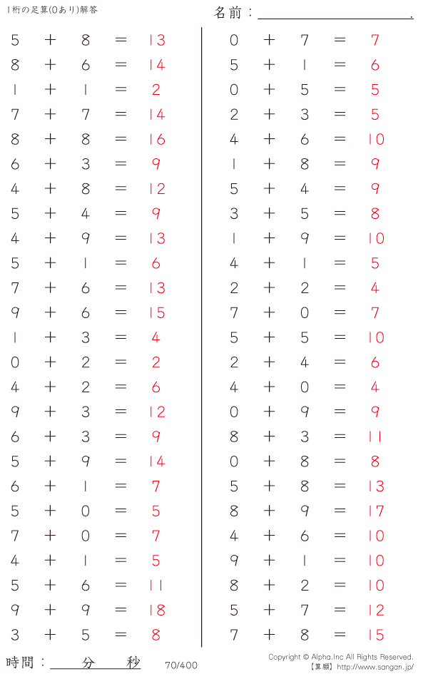 上記のボタンから「1桁の足し算(0あり)」の算数数学ドリル・計算ドリル(PDFプリント)がダウンロードできます。個人利用は無料です(家庭以外での配布は有料です)。