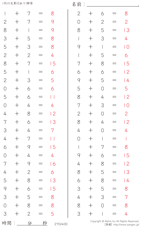 上記のボタンから「1桁の足し算(0あり)」の算数数学ドリル・計算ドリル(PDFプリント)がダウンロードできます。個人利用は無料です(家庭以外での配布は有料です)。