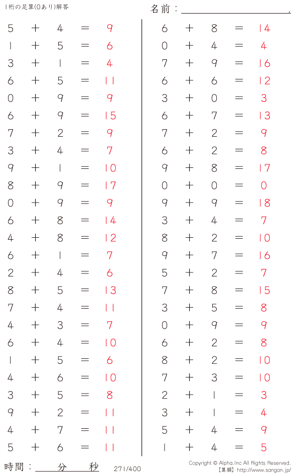 上記のボタンから「1桁の足し算(0あり)」の算数数学ドリル・計算ドリル(PDFプリント)がダウンロードできます。個人利用は無料です(家庭以外での配布は有料です)。
