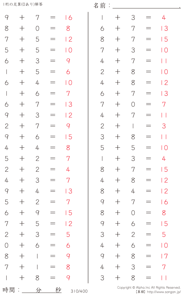 上記のボタンから「1桁の足し算(0あり)」の算数数学ドリル・計算ドリル(PDFプリント)がダウンロードできます。個人利用は無料です(家庭以外での配布は有料です)。