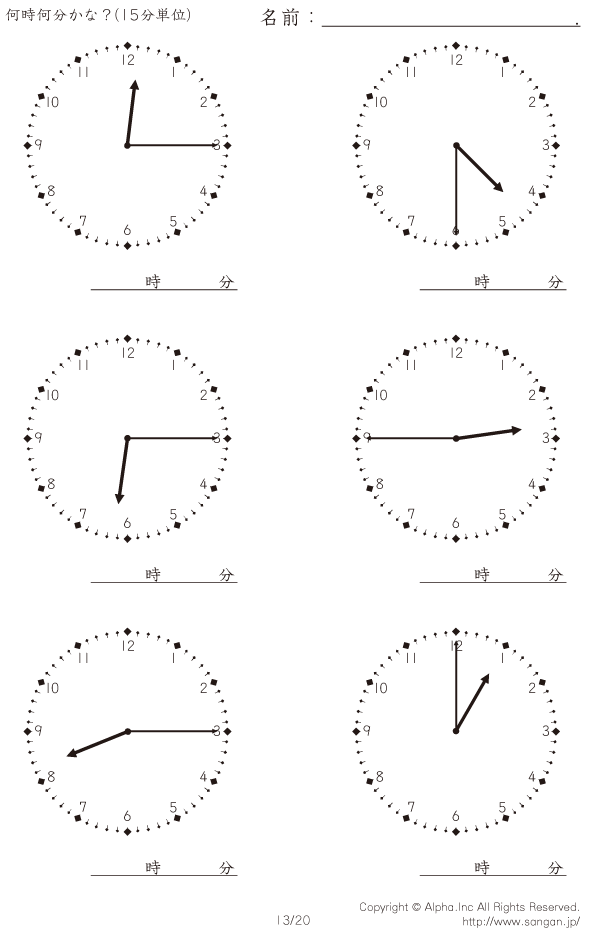 上記のボタンから「アナログ時計を読む 15分単位」の算数数学ドリル・計算ドリル(PDFプリント)がダウンロードできます。個人利用は無料です(家庭以外での配布は有料です)。