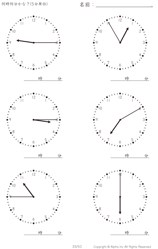 上記のボタンから「アナログ時計を読む 5分単位」の算数数学ドリル・計算ドリル(PDFプリント)がダウンロードできます。個人利用は無料です(家庭以外での配布は有料です)。
