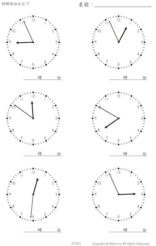 上記のボタンから「アナログ時計を読む 1分単位」の算数数学ドリル・計算ドリル(PDFプリント)がダウンロードできます。個人利用は無料です(家庭以外での配布は有料です)。