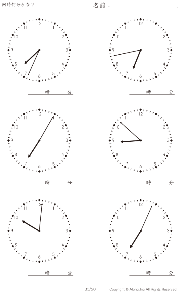上記のボタンから「アナログ時計を読む 1分単位」の算数数学ドリル・計算ドリル(PDFプリント)がダウンロードできます。個人利用は無料です(家庭以外での配布は有料です)。