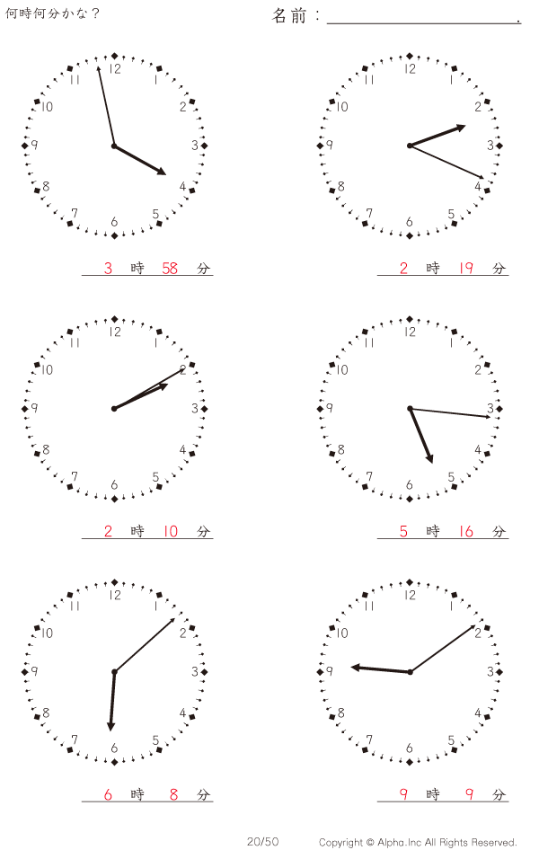 上記のボタンから「アナログ時計を読む 1分単位」の算数数学ドリル・計算ドリル(PDFプリント)がダウンロードできます。個人利用は無料です(家庭以外での配布は有料です)。