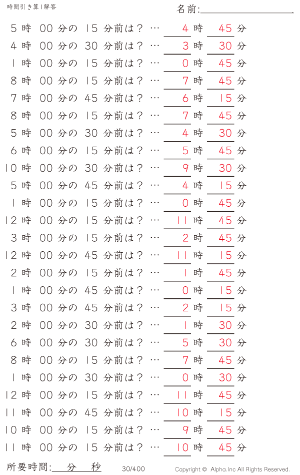 時間引き算1:15分単位(0分から)の問題解答ガイド
