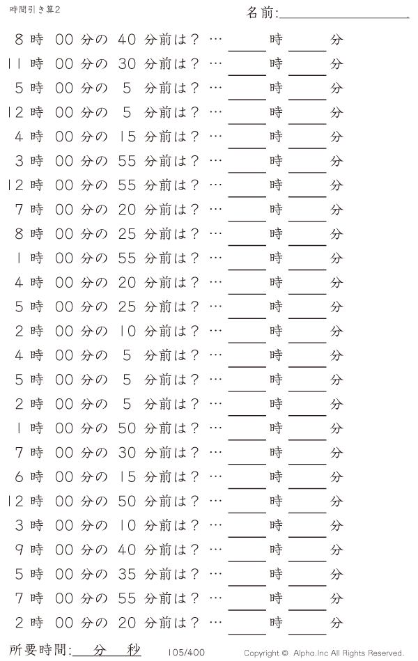 上記のボタンから「時間引き算2:5分単位(0分から)」の算数数学ドリル・計算ドリル(PDFプリント)がダウンロードできます。個人利用は無料です(家庭以外での配布は有料です)。