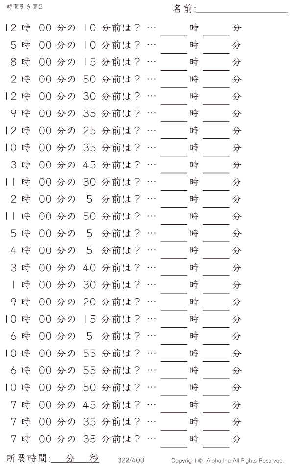 上記のボタンから「時間引き算2:5分単位(0分から)」の算数数学ドリル・計算ドリル(PDFプリント)がダウンロードできます。個人利用は無料です(家庭以外での配布は有料です)。