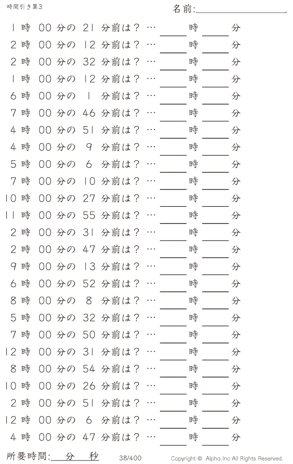 上記のボタンから「時間引き算3:1分単位(0分から)」の算数数学ドリル・計算ドリル(PDFプリント)がダウンロードできます。個人利用は無料です(家庭以外での配布は有料です)。