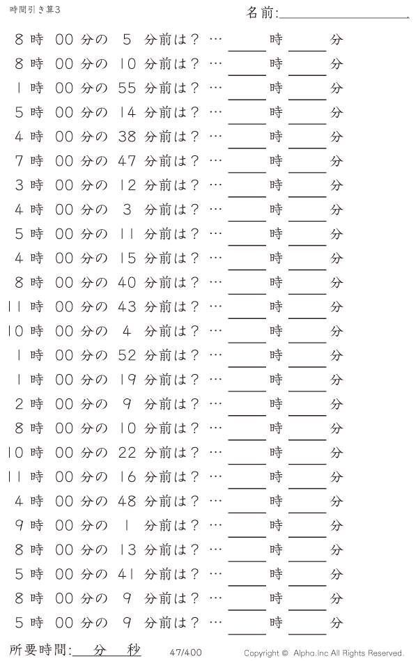 上記のボタンから「時間引き算3:1分単位(0分から)」の算数数学ドリル・計算ドリル(PDFプリント)がダウンロードできます。個人利用は無料です(家庭以外での配布は有料です)。