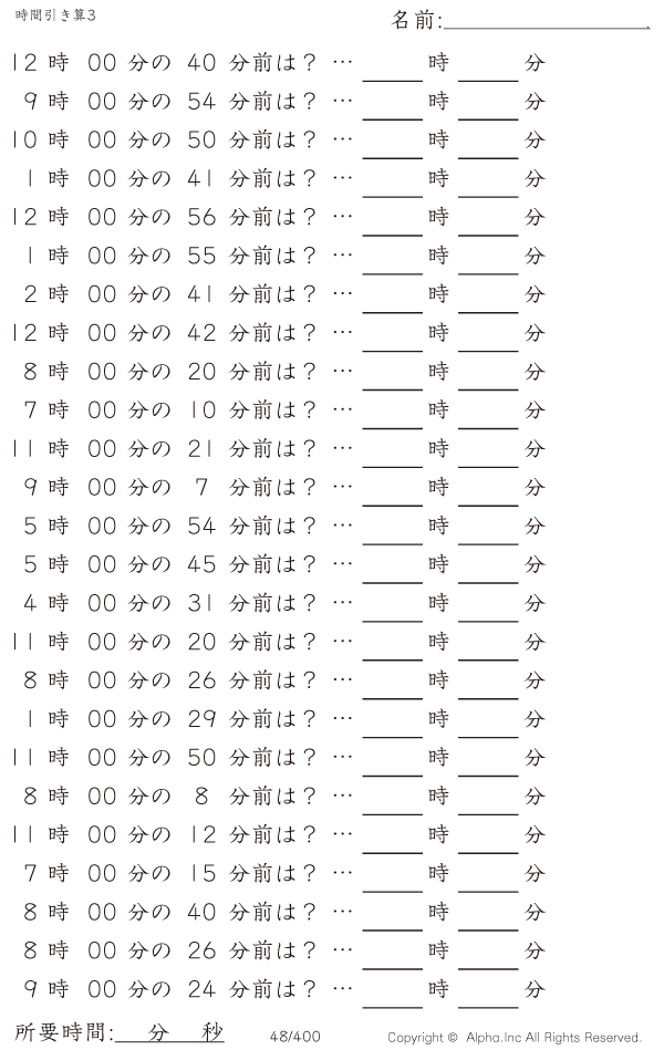 上記のボタンから「時間引き算3:1分単位(0分から)」の算数数学ドリル・計算ドリル(PDFプリント)がダウンロードできます。個人利用は無料です(家庭以外での配布は有料です)。