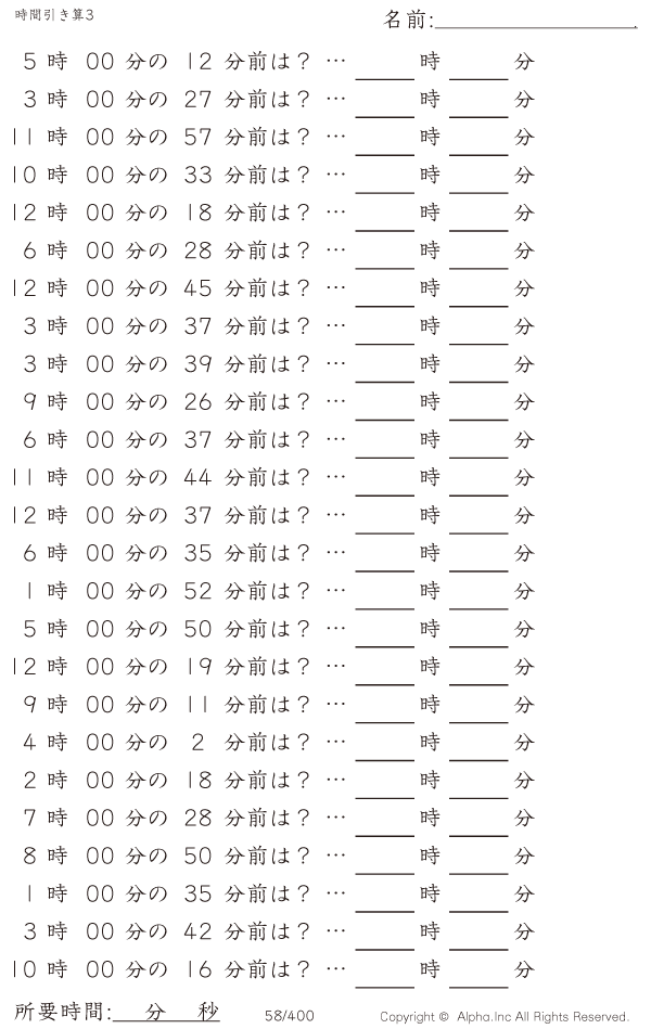 上記のボタンから「時間引き算3:1分単位(0分から)」の算数数学ドリル・計算ドリル(PDFプリント)がダウンロードできます。個人利用は無料です(家庭以外での配布は有料です)。