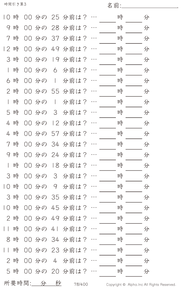 上記のボタンから「時間引き算3:1分単位(0分から)」の算数数学ドリル・計算ドリル(PDFプリント)がダウンロードできます。個人利用は無料です(家庭以外での配布は有料です)。