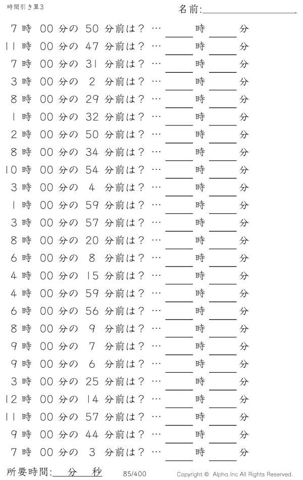 上記のボタンから「時間引き算3:1分単位(0分から)」の算数数学ドリル・計算ドリル(PDFプリント)がダウンロードできます。個人利用は無料です(家庭以外での配布は有料です)。