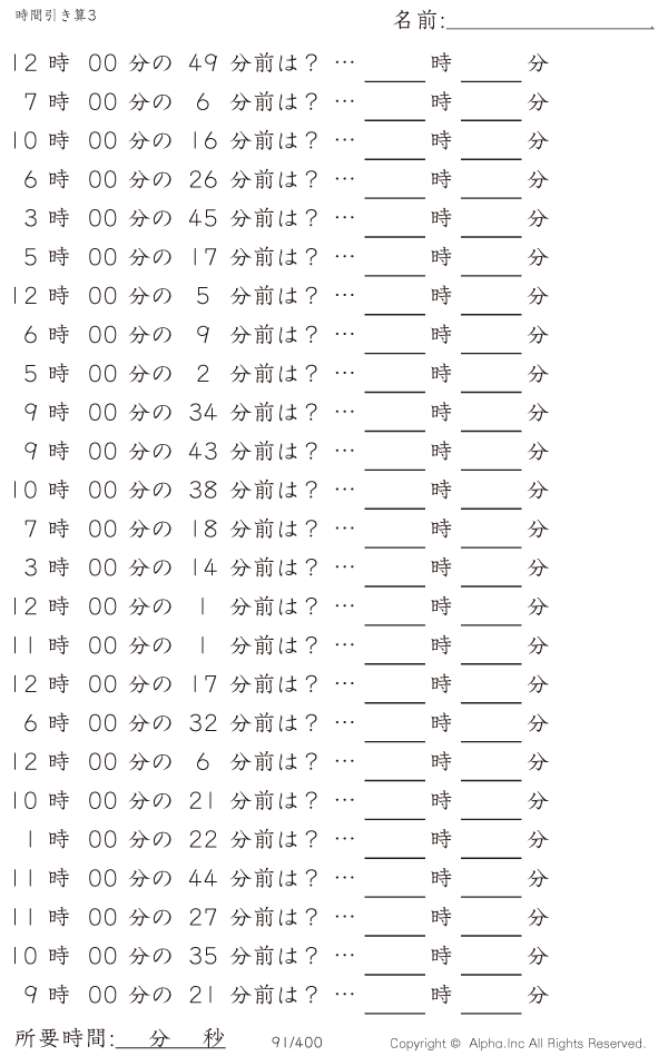時間引き算3:1分単位(0分から) [問題]091/400