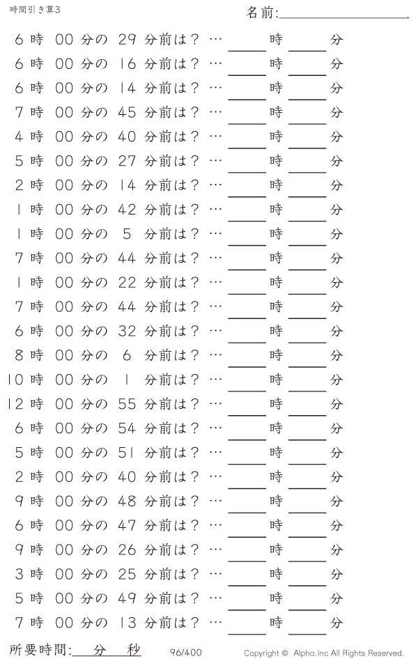 時間引き算3:1分単位(0分から) [問題]096/400