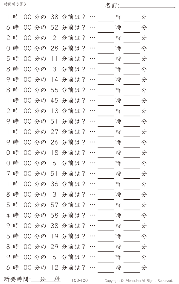 上記のボタンから「時間引き算3:1分単位(0分から)」の算数数学ドリル・計算ドリル(PDFプリント)がダウンロードできます。個人利用は無料です(家庭以外での配布は有料です)。