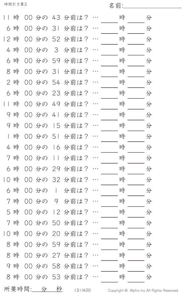時間引き算3:1分単位(0分から) [問題]131/400