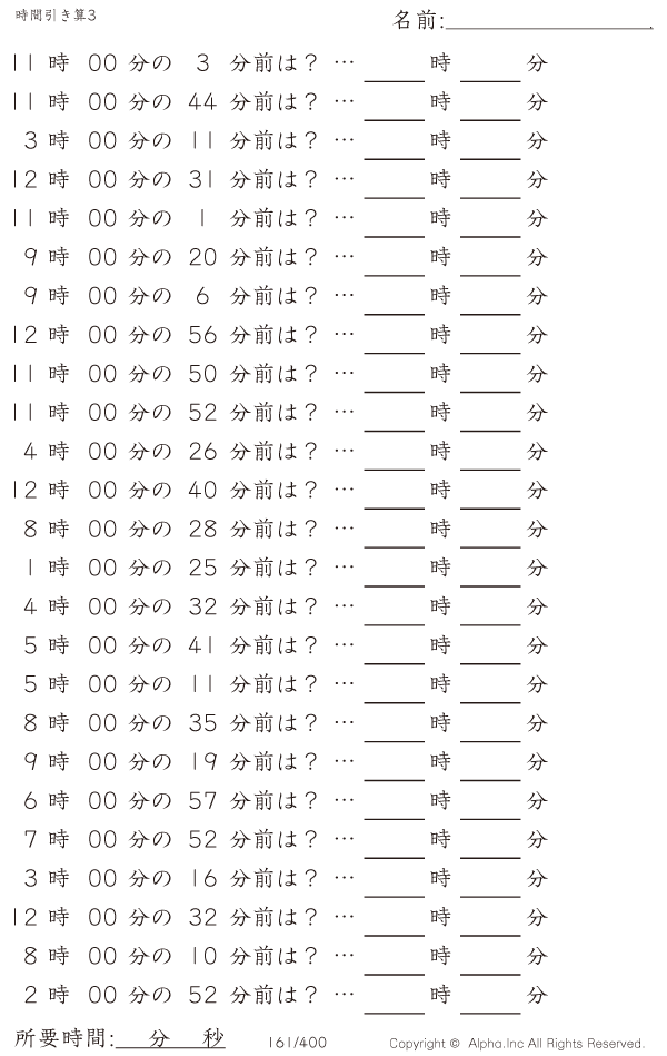 上記のボタンから「時間引き算3:1分単位(0分から)」の算数数学ドリル・計算ドリル(PDFプリント)がダウンロードできます。個人利用は無料です(家庭以外での配布は有料です)。
