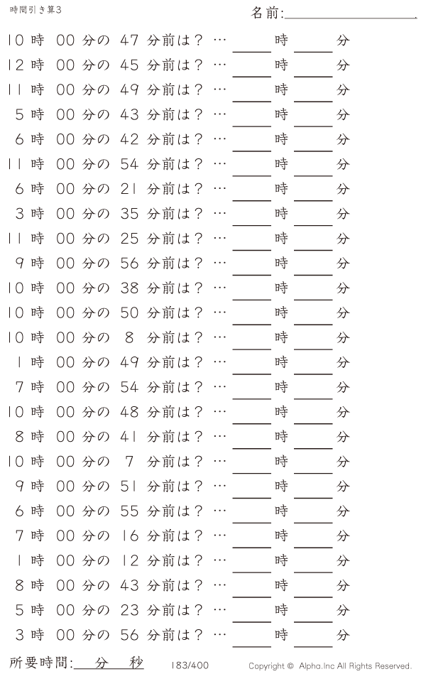 上記のボタンから「時間引き算3:1分単位(0分から)」の算数数学ドリル・計算ドリル(PDFプリント)がダウンロードできます。個人利用は無料です(家庭以外での配布は有料です)。
