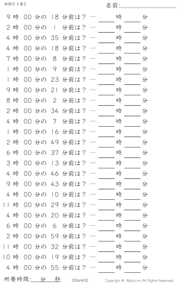 上記のボタンから「時間引き算3:1分単位(0分から)」の算数数学ドリル・計算ドリル(PDFプリント)がダウンロードできます。個人利用は無料です(家庭以外での配布は有料です)。