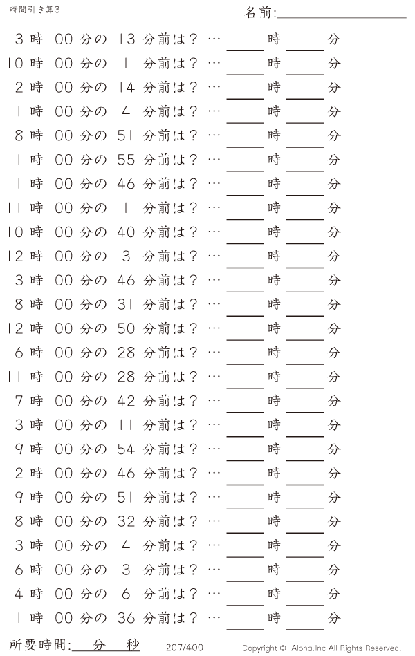上記のボタンから「時間引き算3:1分単位(0分から)」の算数数学ドリル・計算ドリル(PDFプリント)がダウンロードできます。個人利用は無料です(家庭以外での配布は有料です)。