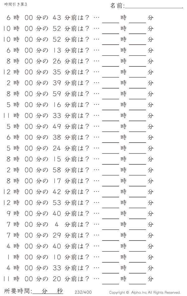 上記のボタンから「時間引き算3:1分単位(0分から)」の算数数学ドリル・計算ドリル(PDFプリント)がダウンロードできます。個人利用は無料です(家庭以外での配布は有料です)。
