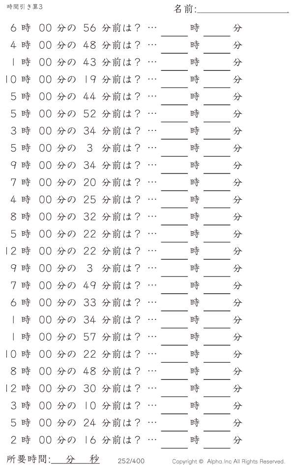 上記のボタンから「時間引き算3:1分単位(0分から)」の算数数学ドリル・計算ドリル(PDFプリント)がダウンロードできます。個人利用は無料です(家庭以外での配布は有料です)。