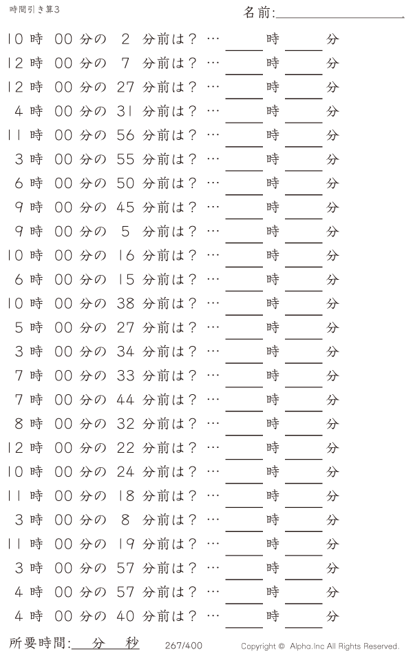 時間引き算3:1分単位(0分から) [問題]267/400