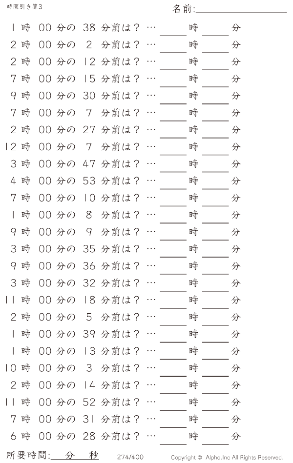 時間引き算3:1分単位(0分から) [問題]274/400