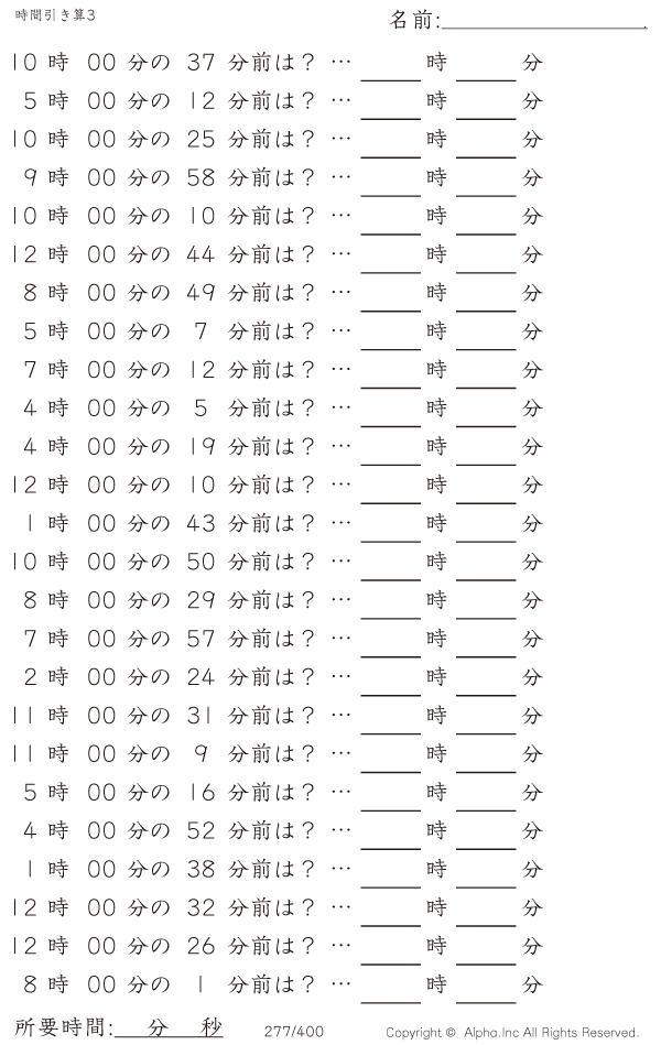 上記のボタンから「時間引き算3:1分単位(0分から)」の算数数学ドリル・計算ドリル(PDFプリント)がダウンロードできます。個人利用は無料です(家庭以外での配布は有料です)。