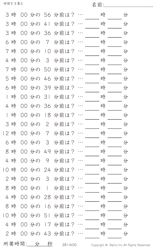 時間引き算3:1分単位(0分から) [問題]281/400