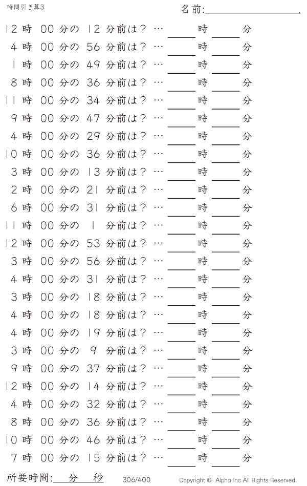 上記のボタンから「時間引き算3:1分単位(0分から)」の算数数学ドリル・計算ドリル(PDFプリント)がダウンロードできます。個人利用は無料です(家庭以外での配布は有料です)。
