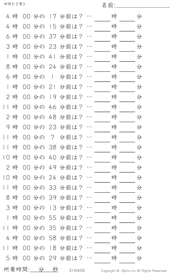 時間引き算3:1分単位(0分から) [問題]310/400