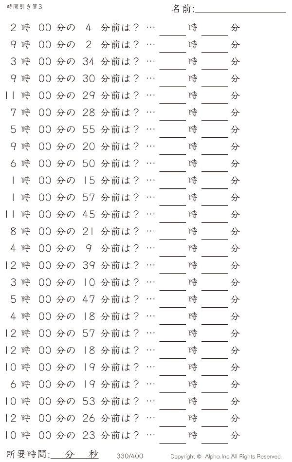上記のボタンから「時間引き算3:1分単位(0分から)」の算数数学ドリル・計算ドリル(PDFプリント)がダウンロードできます。個人利用は無料です(家庭以外での配布は有料です)。