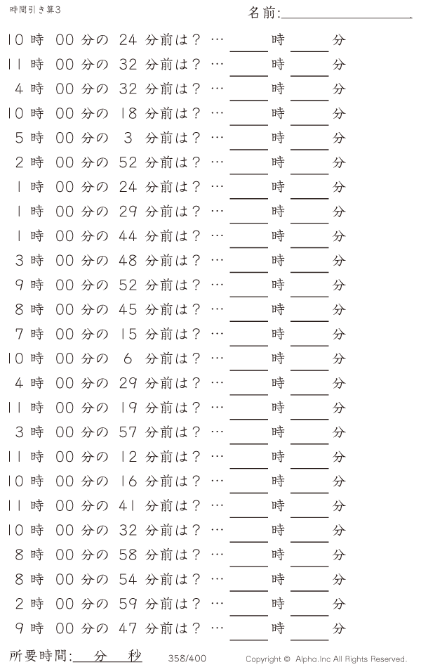 時間引き算3:1分単位(0分から) [問題]358/400