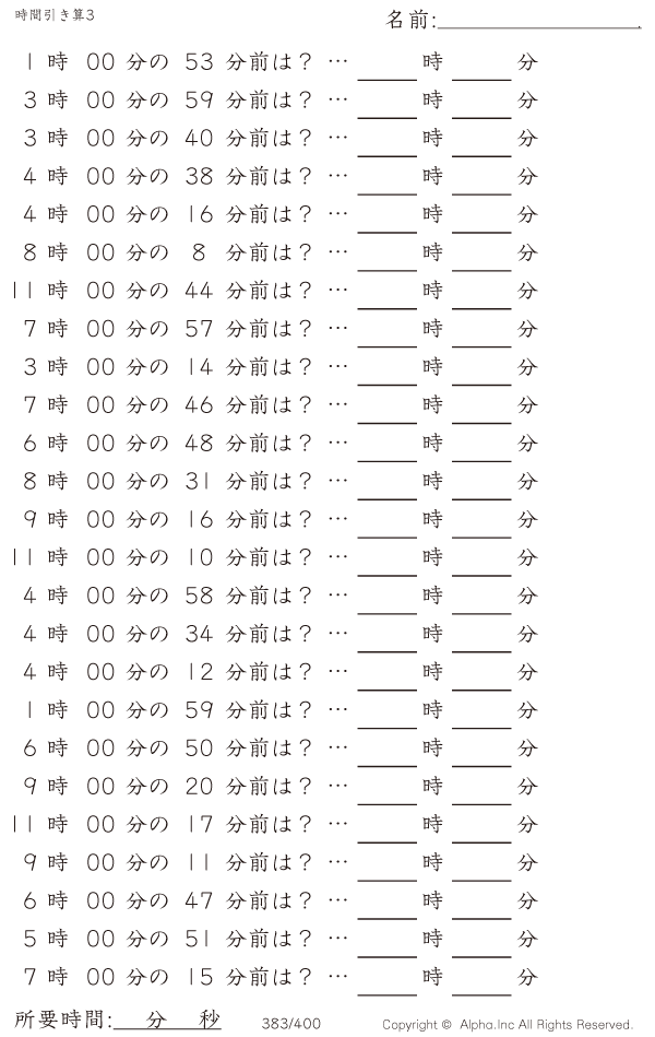 上記のボタンから「時間引き算3:1分単位(0分から)」の算数数学ドリル・計算ドリル(PDFプリント)がダウンロードできます。個人利用は無料です(家庭以外での配布は有料です)。